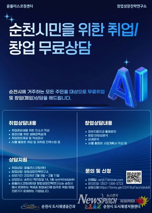 뉴스펀치 최영남 기자 | 순천시는 순천역전 창업마루(도시재생 거점시설)에 입주한 창업컨설팅 전문기업 주관으로 ‘취업·창업 무료상담’을 진행할 예정이다.
