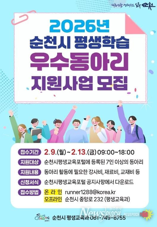 뉴스펀치 김용희 기자 | 순천시가 지역사회 평생학습 문화 확산을 위해 오는 9일부터 13일까지 ‘2026년 평생학습 우수동아리 지원사업’에 참여할 동아리를 모집한다고 밝혔다.