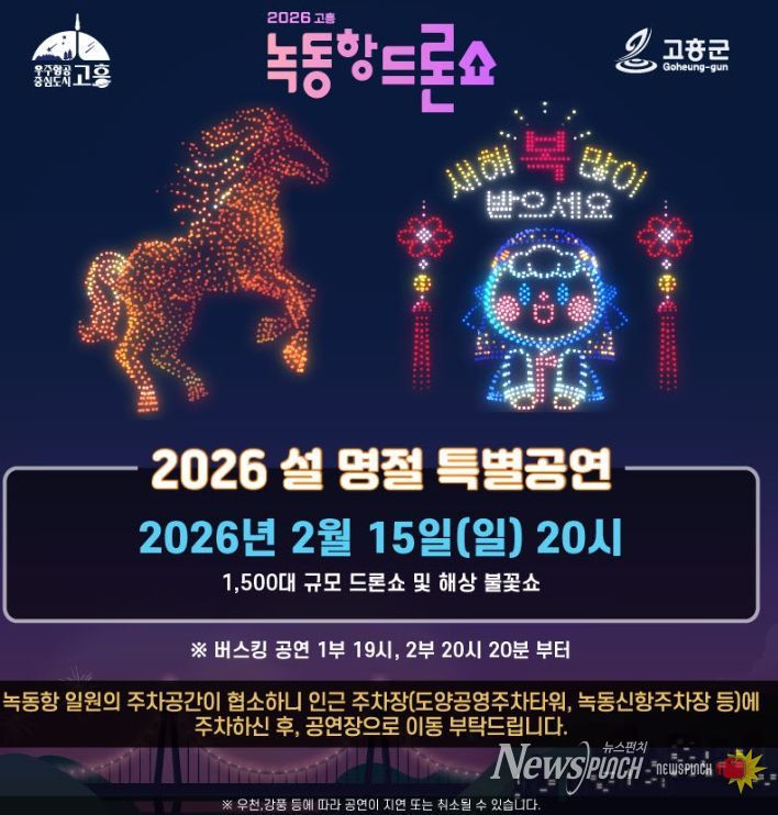 설 특별공연은 기상 상황에 따라 지연되거나 취소될 수 있으며, 정확한 공연 일정은 고흥군 대표 누리집과 녹동항 드론쇼 누리집, 인스타그램을 통해 확인할 수 있다.