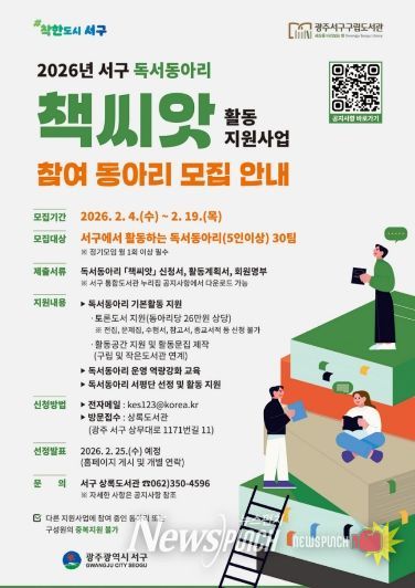 뉴스펀치 김용희 기자 | 광주광역시 서구가 주민 주도의 독서 문화를 활성화하고 책을 통한 소통과 나눔을 확산하기 위해 독서동아리 ‘책씨앗’ 활동 지원사업을 추진한다.