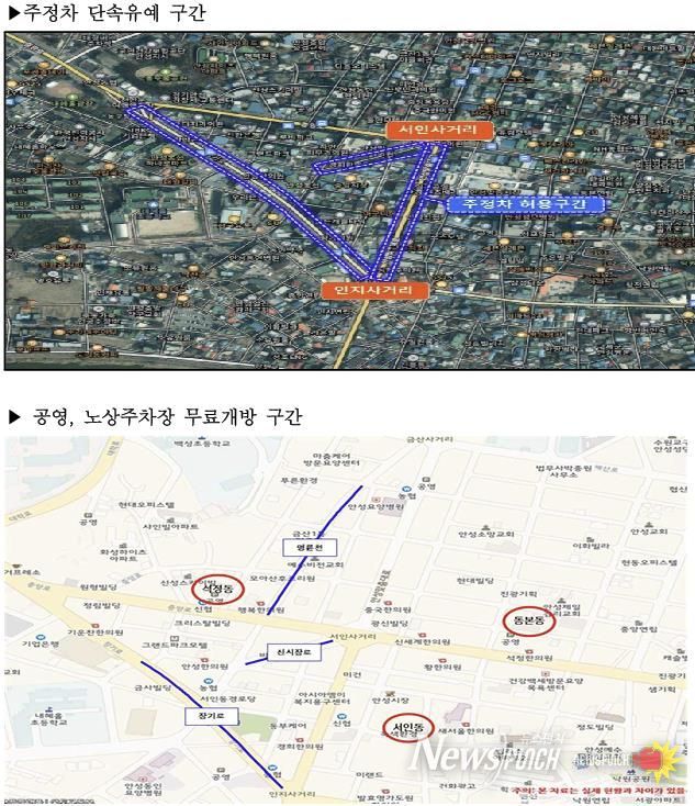 주정차 단속 유예 구간은 안성맞춤시장(서인사거리~인지사거리 구간 양측 300미터)과 중앙시장(서인사거리~안성농협 양측 100미터, 석정삼거리~인지사거리 양측 500미터) 주변 도로이며, 서인동·동본동·석정동의 건축식 공영주차장과 전통시장 주변 노상주차장이 무료 개방된다.