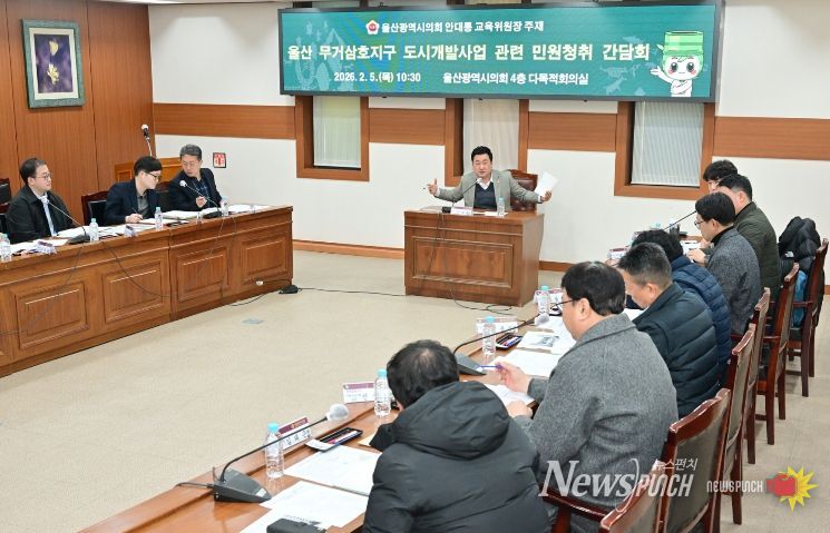 뉴스펀치 김윤걸 기자 | 울산광역시의회 교육위원회 안대룡 위원장(삼호동, 무거동)은 5일 시의회 4층 다목적 회의실에서 무거·삼호지구 공사 현장 인근 문수비스타동원 입주민들과 함께 입주 완료 이후 발생하고 있는 생활환경 피해 민원 청취 간담회를 개최 했다.