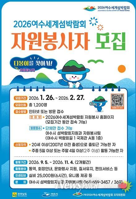 한편, 자원봉사자 신청은 2026여수세계섬박람회 자원봉사 누리집을 통해 온라인으로 접수할 수 있으며 활동에 참여한 다봉이에게는 1일 6시간 기준 활동 실비 2만 5천 원이 지급될 예정이다.