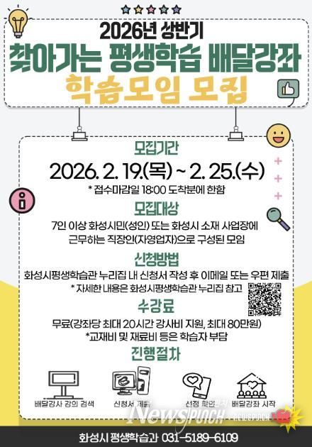뉴스펀치 박상훈 기자 | 화성특례시는 2월 19일부터 2월 25일까지 2026년 상반기'찾아가는 평생학습 배달강좌'학습모임을 모집한다.