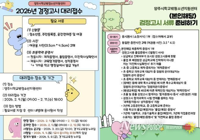 뉴스펀치 박상훈 기자 | 양주시학교밖청소년지원센터에서는 학교 밖 청소년들을 위해 2026년 제1회 초중고 졸업 학력 검정고시 응시 원서 접수 대행을 지원한다.