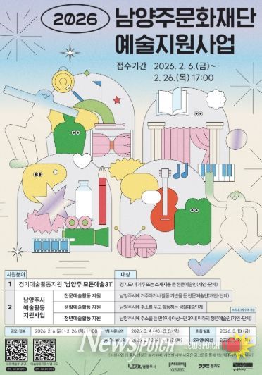뉴스펀치 박상훈 기자 | 남양주시는 6일 남양주문화재단이 지역 예술인의 안정적인 창작 환경 조성과 시민 문화향유 기회 확대를 위해 ‘2026년 예술활동 지원사업 공모’를 추진하고, 오는 26일까지 접수를 진행한다고 밝혔다.