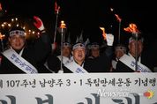 뉴스펀치 박상훈 기자 | 남양주시는 27일 화도읍 월산교회에서 남양주문화원 주최로 열린 3.1독립만세운동 기념행사가 성황리에 마무리했다고 밝혔다. 이번 행사는 남양주 지역에서 전개된 독립만세운동의 역사적 의미를 되새기고, 지역 독립운동 정신을 계승하기 위해 마련됐다. 행사에는 주광덕 남양주시장을 비롯해 조성대 남양주시의장, 남양주문화원장, 경기북부보훈지청장, 광복회 남양주시지회장, 도·시의원, 독립유공자 후손과 시민 등 300여 명이 참석해 독립 정신을 되새겼다. 행사는 총 3부로 운영됐으며, 1부에서는 기념식과 기념예배가 진행됐다. 시립합창단의 식전공연을 시작으로 기념예배, 주광덕 시장의 경축사와 독립선언서 낭독 등이 이어졌다. 2부에서는 월산교회에서 마석역 광장까지 ‘횃불 대행진’을 진행했다. 풍물패와 군부대의 인도 아래 시민들이 직접 횃불을 들고 행진하며 1919년 당시의 긴박했던 만세 운동 현장을 재현했다. 마지막으로 3부에서는 모든 참석자들이 마석역 광장에서 삼일절 노래 제창과 만세삼창을 외치며 행사의 대미를 장식했다. 주광덕 시장은 “3.1운동의 정신은 과거에 머물지 않고 오