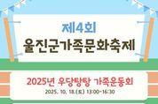 뉴스펀치 김길룡 기자 | 울진군은 울진군가족센터가 오는 10월 18일 오후 1시부터 평해생활체육공원 축구장에서 제4회 울진군가족문화축제‘우당탕탕 가족운동회’를 개최한다. 이번 축제는 지난해에 이어 두 번째로 열리는 가족운동회로, 온 가족이 함께 어울려 즐길 수 있는 체험과 놀이 프로그램이 준비된다. 연 만들기, 달고나 만들기, 키링 만들기 등 체험 부스를 마련해 다양한 즐길 거리를 제공하며, 가족 대항 레크리에이션, 행운권 추첨 등 푸짐한 선물이 준비되어 있어 참여 가족 모두가 특별한 추억을 만들 수 있도록 다채롭게 구성할 예정이다. 행사는 오후 1시부터 오후 4시 30분까지 운영되며 울진군민 2인 이상 가족이면 누구나 무료로 참여 가능하다. 참가 신청은 울진군가족센터 홈페이지를 통해 가능하며, 자세한 사항은 유선으로 문의하면 된다. 손병복 울진군수는“이번 축제가 세대가 함께 어울리고 소통하는 장이 되어 가족의 소중함을 다시금 느끼는 계기가 되길 바라며 군민여러분의 많은 참여를 부탁드린다”라고 말했다.