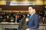 뉴스펀치 김용희 기자 | 광주광역시는 6일 구례군 백두대간생태교육장 세미나실에서 ‘광주전남 통합 구례군 상생토크’를 열고, 구례 발전 전략과 통합 이후 변화에 대해 구례군민들과 소통했다. 이날 상생토크는 전남 시·군을 순회하며 진행 중인 열 번째 자리로, 지리산과 섬진강 등 구례군의 천혜 생태 자원과 천년문화자산을 활용한 광주·전남의 균형발전 방향을 모색하기 위해 마련됐다. 이날 행사에는 강기정 광주시장을 비롯해 오수미 구례군 부군수, 읍면 주민대표, 구례군민 등 120여 명이 참석해 광주전남 통합 추진에 대한 높은 관심을 보였다. 강기정 시장은 광주전남 통합 추진 상황과 향후 일정, 통합에 대한 정부 특전(인센티브) 등을 설명하며 통합의 추진 의지를 밝혔다. 이어 구례군과 관련된 특별법안 특례조항으로 ▲생태관광 활성화 지원 ▲문화유산 보존 및 활용 ▲지역 교통 기반시설 개선 등을 소개했다. 특히 구례의 풍부한 자연환경과 문화유산을 기반으로 생태관광과 문화산업을 육성하고, 광주와 협력을 통해 지역 발전을 이끌겠다는 구상을 밝혔다. 강 시장은 ▲전라선 고속화 등 광역교통망 확충 ▲유기농산업 등 농·수