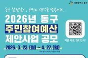뉴스펀치 이현승 기자 | 대전 동구는 2026년 주민참여예산 제안사업을 본격 추진하며, 내달 27일까지 공모 접수를 실시한다고 24일 밝혔다. ‘주민참여예산제’는 주민이 사업 발굴부터 심사, 선정까지 예산 편성 전 과정에 직접 참여해 지역에 필요한 사업을 제안하는 제도다. 이번 공모는 총 1억 원 규모로 추진되며, 사업별 2천만 원 한도 내에서 행정동 단위 ‘주민 생활밀착형 소규모 단년도 사업’을 대상으로 한다. 참여 대상은 동구 주민을 비롯해 지역 내 직장인과 학생, 비영리단체 회원 등 누구나 가능하며, 동 행정복지센터 방문 또는 주민참여예산제 전용 온라인 플랫폼(동구 홈페이지 ' 구민참여 ' 주민참여예산제)을 통해 신청할 수 있다. 접수된 제안사업은 사업 추진부서의 적격성 검토와 동 지역회의 심사를 거쳐, 온라인 구민투표 및 동구 주민참여예산위원회 심의를 통해 최종 선정된다. 선정된 사업은 2027년도 본예산에 반영돼 추진될 예정이다. 박희조 동구청장은 “주민의 시선에서 발굴된 사업이 지역에 실질적인 변화를 만들어내는 출발점이 될 것”이라며 “생활 속에서 체감할 수 있는