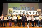 뉴스펀치 정홍균 기자 | 100세 시대를 맞아 전주지역 노인들의 행복하고 건강한 노후생활을 함께 염원하는 노인의날 기념식이 열렸다. 전주시와 대한노인회 전주시지회(지회장 홍성언)는 14일 전주학생교육문화관 공연장에서 우범기 전주시장과 최주만 전주시의회 부의장, 김두봉 대한노인회 전북특별자치도연합회장, 표창 수상자 등 1200여 명이 참석한 가운데 ‘제29회 전주시 노인의날 기념식’을 가졌다. 송민주 대한노인회 전주시지회 사무국장의 사회로 진행된 이날 기념식은 △무지개예술자원봉사단(단장 고대현)과 아름다운 실버 전주의꽃(단장 김인식)의 식전 공연 △노인 강령 낭독 △청려장(장수지팡이) 수여 △전주시장 및 전주시의장 표창 수여식 △노인복지공로자에 대한 공로장 수여식 등의 순으로 진행됐다. 특히 우범기 전주시장은 이날 기념식에서 올해 100세를 맞이한 김옥순 어르신(여, 덕진동)에게 무병장수의 상징인 청려지팡이를 전달했으며, 홍성언 지회장은 축하의 꽃다발을 선물했다. 홍성언 대한노인회 전주시지회장은 “풍성했던 한가위도 지나가고, 땀과 노력으로 이뤄낸 결실의 계절 가을을 맞이해 참석해 주신 우범기 전주시