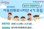 뉴스펀치 조평훈 기자 | 대구 달서구는 아동 정책에 대한 의견을 제시하고 아동권리 증진 활동에 참여할‘아동친화모니터단 4기’단원을 오는 27일까지 모집한다. 달서구 아동친화모니터단은 아동이 행복한‘아동친화도시 달서구’조성을 위한 아동참여기구로, 달서구에 주민등록을 둔 만 7세 이상 18세 미만의 초·중·고등학생 및 학교밖청소년이면 누구나 신청할 수 있다. 모집 인원은 30명 내외다. 공개모집 또는 기관 추천을 통해 선발된 단원들은 4월 위촉식을 시작으로 2년간 활동하며 ▲ 아동친화도시 조성을 위한 정책 제언, ▲ 아동권리 교육 및 캠페인 참여, ▲ 아동권리 모니터링 등 다양한 활동에 참여하게 된다. 달서구는 지난 2020년 1기 출범 이후 아동친화모니터단을 운영하며 아동이 지역사회 정책에 참여하고 아동 권리 증진 활동에 직접 참여할 수 있는 기회를 지속적으로 확대해 왔다. 참여를 희망하는 아동·청소년은 신청서를 작성해 달서구청 아동친화과로 방문 접수하거나 이메일로 제출하면 된다. 신청서 서식은 달서구청 홈페이지 또는 모집 포스터의 QR코드를 통해 내려받을 수 있다. 이태훈
