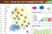 뉴스펀치 조평훈 기자 | 국토교통부와 한국부동산원(원장 손태락)은 '25년 3분기 지가변동률 및 토지거래량을 발표했다. ★ 지가변동률 '25년 3분기 전국 지가는 0.58% 상승했다. 상승폭은 '25년 2분기(0.55%) 대비 0.03%p 확대, '24년 3분기(0.59%) 대비 0.01%p 축소된 것으로 나타났다. '25년 9월 지가변동률은 0.20%로, '25년 8월(0.19%) 대비 0.01%p, '24년 9월(0.19%) 대비 0.01%p 높은 수준으로 나타났다. (지역별) '25년 3분기 지가변동률은 수도권(0.74% → 0.80%)은 '25년 2분기 변동률 대비 높은 수준, 지방권(0.22% → 0.19%)은 낮은 수준을 보였다. (시·도) 17개 시·도 중 서울(1.07%)이 전국 평균(0.58%)을 상회했다. (시·군·구) 서울 용산구 1.96%, 서울 강남구 1.68%, 서울 서초구 1.35% 등 252개 시군구 중 40개 시군구가 전국 평균을 상회했다. 또한, 252개 시군구 중 199개 시군구가 0.00% ~ 0.80% 수준을 나타내었으며, 주로 수도권