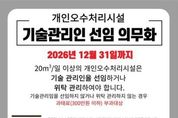 뉴스펀치 천세두 기자 | 서귀포시는 기술관리인 선임 대상이 되는 개인오수처리시설 기준이 현행 50톤 이상에서 2027년 1월부터 20톤 이상으로 확대됨에 따라, 오는 11월까지 20톤 이상 50톤 미만의 개인오수처리시설 180개소를 대상으로 집중 홍보를 실시한다고 밝혔다. 올해 서귀포시는 50톤 미만 개인오수처리시설 3,133개소를 대상으로 운영실태조사 및 기술지원 용역을 추진하고 있다. 앞으로 기술관리인을 새로 선임해야 하는 20톤 이상 50톤 미만 시설 소유주를 대상으로 제도 시행에 대한 사전 안내와 함께 시설 관리 요령을 집중적으로 홍보할 방침이다. 기술관리인을 미선임하거나, 선임 이후에도 관리가 미흡해 과태료가 부과되는 사례가 발생할 수 있다. 이에 따라 서귀포시는 소유주의 관심과 책임 있는 시설관리가 무엇보다 중요하다고 강조하며, ▲자체 제작한 안내문을 직접 현장에서 배부하고 ▲시설 운영 실태를 재차 점검해 소유주의 관심도와 관리 역량을 높여나갈 방침이다. 올해 상반기 기술관리인이 선임된 50톤 이상 시설을 점검한 결과, 방류수 수질 기준을 초과한 18개소(43개소 점검)에 대해 23백만원의 과태료를