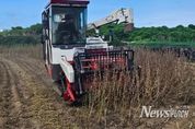 뉴스펀치 천세두 기자 | 제주특별자치도 농업기술원 동부농업기술센터는 기계수확용으로 개발된 신품종 ‘하니올’ 참깨를 콤바인으로 본격 수확하고 있다. 매년 8월 참깨 수확은 무더운 날씨 속에서 낫으로 베고 묶는 전 과정이 대부분 수작업으로 이뤄져 많은 노동력이 투입돼 왔다. 기존 품종은 꼬투리가 아래에서 위로 익어가며 낟알이 떨어진다. 농가에서는 가장 아래 꼬투리가 익는 시점에 베어 단으로 묶은 뒤, 1~2주간 노지에서 건조 후 낟알을 2회 정도 털어내는 과정을 거치며, 이 과정에서 비가 내릴 경우 투명 비닐을 덮어 바람에 날리지 않도록 고정하는 등 추가 노동도 필요하다. 동부농업기술센터는 지난 5월부터 19ha 면적에서 ‘하니올’을 시범 재배해 지난 21일부터 동부지역 참깨 재배 농가에서 콤바인 수확을 진행했다. 이번 시범재배를 통해 기존 수작업 방식과 달리 기계를 활용할 경우 수확 노동력이 약 99%로 크게 절감되는 효과가 확인됐다. 콤바인으로 줄기 베기와 두 차례 반복하는 낟알 떨기를 동시에 진행할 수 있어 고온기 힘든 작업을 크게 줄일 수 있었다. 또한 비를 피해기 위해 비닐을 덮어