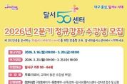 뉴스펀치 조평훈 기자 | 대구 달서구는 50플러스세대의 역량 강화와 자기계발을 지원하기 위해‘2026년 2분기 달서50플러스센터 정규강좌’수강생을 3월 16일부터 25일까지 선착순 모집한다. 달서50플러스센터는 50~64세 중장년층이 제2의 인생을 준비할 수 있도록 다양한 평생교육 프로그램을 분기별로 운영하고 있다. 이번 2분기 강좌는 자격증, 취·창업, 디지털, 어학, 음악·미술 등 9개 분야 총 27개 과정으로 구성된다. 교육은 2026년 4월 13일부터 6월 26일까지 강좌별 최대 10주 과정으로 운영되며, 50플러스세대를 위한 창업 특강과 스트레스 관리 기획특강도 함께 진행될 예정이다. 신청 대상은 주민등록상 달서구에 거주하는 50~64세 주민이며, 수강료는 무료이다. 수강 신청은 인터넷 접수 또는 전화 접수로 가능하며, 자세한 내용은 달서구청 홈페이지 통합예약 시스템을 확인하거나 달서50플러스센터로 문의하면 된다. 이태훈 달서구청장은 “자격증 취득과 취·창업 등 다양한 교육 프로그램을 통해 50플러스세대가 제2의 인생을 스스로 설계하고 새로운 활력을 찾을 수 있기를