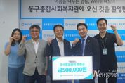 뉴스펀치 김길룡 기자 | 부산 동구, 동구종합사회복지관은 근로복지공단 부산지역본부에서 10월 1일 추석 명절을 앞두고, 동구 지역 소외계층에게 힘이 될 수 있도록 50만 원의 후원금을 동구종합사회복지관에 전달했다고 밝혔다. 해당 성금은 동구 지역 내 취약계층의 추석 명절맞이 지원으로 활용될 예정이다. 이외에도 근로복지공단 부산지역본부에서는 임직원들이 매주 수요일마다 복지관 4층 장난감도서관을 방문해 어린아이들이 안전하게 놀 수 있도록 장난감 소독 봉사활동에 꾸준히 참여하고 있다. 민병창 근로복지공단 부산지역본부장은 “어른, 아이 할 것 없이 모두가 행복하고 즐거운 동구가 될 수 있도록 앞으로도 다양한 활동을 통해 사회공헌사업을 이어나가겠다” 고 밝혔다.