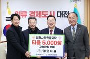 뉴스펀치 김길룡 기자 | 명원타올(석영일 대표)은 12일 오전 8시30분, 대전시청 10층 응접실에서 타올 5,000장(5천만 원 상당)을 대전사랑시민협의회에 기탁했다. 이날 기탁식에는 이장우 대전시장, 남재동 대전사랑시민협의회 회장, 석영일 명원타올 대표 등이 참석했다. 이번에 기탁된 물품은 대전 관내 취약계층(장애인, 독거노인 등)에 전달될 예정이다.