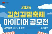 뉴스펀치 박세훈 기자 | 김천시는 국민과 함께 만들어가는 참여형 축제를 위해 ‘2026 김천김밥축제 아이디어 공모전’을 개최한다. 이번 공모전은 김천김밥축제를 더욱 참신하고 경쟁력 있는 축제로 발전시키기 위해 국민의 창의적인 아이디어를 발굴하고, 우수 콘텐츠를 실제 축제 프로그램에 반영하고자 마련됐다. 공모 기간은 3월 3일부터 4월 30일까지이며, 대한민국 국민 누구나 참여할 수 있다. 공모 주제는‘김밥’을 소재로 한 축제콘텐츠 아이디어로, ▲체험·참여 프로그램 ▲이색 테마존 및 공간연출 ▲어린이·가족·MZ세대·외국인 대상 맞춤형 콘텐츠 ▲지역 관광자원과 연계한 프로그램 ▲캐릭터 굿즈 및 브랜드 확장 등 다양한 분야에서 자유롭게 제안할 수 있다. 접수된 아이디어는 전문가 심사(80%)와 일반인 온라인 심사(20%)를 거쳐 총 10개 아이디어를 선정하며, 수상자에게는 상장과 함께 최우수상 100만 원 등 총 510만 원 규모의 시상금이 수여된다. 선정된 아이디어는 검토를 거쳐 실제 축제 현장에 반영될 예정이다. 김천시는 이번 공모전을 통해 국민이 직접 참여하고 아이디어를 제안하는 개방