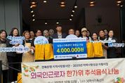 뉴스펀치 정홍균 기자 | 남원시가족센터는 지난 10월 2일 고유 명절인 추석을 맞이하여 관내 외국인근로자를 대상으로 음식나눔 행사를 실시했다. 이번 외국인근로자 추석음식 나눔은 JB금융그룹 전북은행 지역사랑성금 400만원을 지원받아 진행됐다. 남원시가족센터에서는 2016년부터 외국인 근로자를 대상으로 한국어 교육을 실시해 왔으며, 현재는 8개반 37명이 한국어 교육 서비스를 받고 있다. 또한 남원시가족센터는 외국인지원센터를 운영하여 증가하는 외국인 주민들의 안정적인 정착을 돕고, 지역사회의 일원으로서 통합을 지원하기 위한 다양한 체류 지원 서비스를 제공하고 있다. 이번 명절 한가위 음식나눔 꾸러미는 찰밥, 산적, 떡, 과일, 생활용품으로 구성되어 있으며, 다양한 국가(캄보디아, 미얀마, 네팔, 스리랑카, 방글라데시 등)의 근로자 70명에게 전달됐다. 나찬도 센터장은 “다문화가족과 지역민, 그리고 센터가 삼위일체가 되어 서로 소통하고 이주민들의 한국 사회정착을 적극적으로 지원하고 함께하는 센터가 되도록 적극적으로 수행해 나가겠다”라고 소감을 밝혔다. 여성가족과 김미옥과장은 “