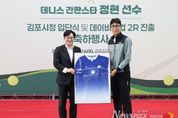 뉴스펀치 박상훈 기자 | 김포시는 17일 솔터실내테니스장에서 대한민국 테니스 스타 정현 선수의 김포시청 직장운동경기부 테니스팀 입단을 기념하고, 데이비스컵 2라운드 진출을 축하하는 행사를 개최했다. 이날 행사에는 김병수 김포시장을 비롯해 임청수 김포시체육회장, 박헌규 김포시테니스협회장과 테니스 관계자 및 동호인 등이 참석해 자리를 빛냈다. 행사는 시민과 동호인을 대상으로 한 팬 사인회를 시작으로 정현 선수의 주요 활약상을 담은 영상 상영, 기념 퍼포먼스, 입단 소감 및 축사 순으로 진행됐다. 특히 이날 행사에서는 정현 선수가 최근 데이비스컵 경기에서 실제 착용한 유니폼을 기념 액자로 제작해 김병수 시장에게 전달하는 의미 있는 시간이 마련됐다. 해당 유니폼은 국가대표 경기 특성상 소속팀 마크를 부착할 수 없음에도 불구하고, 정현 선수가 김포시청 입단을 기념하고 김포시를 알리기 위해 대한테니스협회에 요청해 특별히 김포시청 마크를 부착하고 출전한 것으로 알려져 의미를 더했다. 이어 김병수 시장은 정현 선수에게 꽃다발을 전달하고, 정현 선수의 유니폼에 김포시청 마크를 부착하는 퍼포먼스를 통해 김포시청 선수