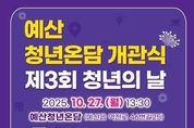 뉴스펀치 김길룡 기자 | 예산군은 오는 10월 27일 오후 1시 30분, 예산읍 주교리에 위치한 청년거점공간 ‘예산청년온담’에서 개관식과 제3회 청년의 날 기념행사를 개최한다고 밝혔다. 이번 행사는 청년 인구 감소와 지역 소멸 위기에 대응하기 위해 조성된 청년 거점공간의 개관을 기념하기 위해 마련됐으며, 당초 법정기념일(9월 셋째 주 토요일)에 예정됐던 청년의 날 행사가 수해로 연기됨에 따라 두 행사를 함께 진행한다. 행사는 식전공연을 시작으로 △개관식 △청년의 날 기념식 △청년특강 순으로 진행되며, 지역 청년들이 대거 참석할 예정이다. ‘예산청년온담’은 청년 전용 복합공간으로, 연면적 2,092.96㎡, 지하 1층·지상 2층 규모로 조성됐으며, 내부에는 북카페, 공유오피스, 스터디룸, 강의실, 공유주방 등 다양한 공간이 마련돼 있어 청년들의 창업·학습·휴식·소통이 어우러지는 열린 플랫폼으로 운영될 예정이다. 특히 이번 행사에는 서울대학교병원 강남센터 정신건강의학과 윤대현 교수가 초청돼 ‘청년, 단단한 멘탈로 나아가다 – 불안을 용기로 바꾸는 마음 근육 키우기’를 주제로 특강을 진행하며, 윤 교수는