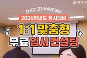 뉴스펀치 김완규 기자 | 서울 강서구가 2026학년도 대학 정시모집을 앞두고 관내 고등학교 3학년과 재수생, 학부모를 대상으로 ‘1대1 맞춤형 대입 진학 컨설팅’을 운영한다. 컨설팅은 오는 12월 20일부터 21일까지 이틀간 강서평생학습관(공항대로 615) 2층 강당에서 진행된다. 구는 정시모집 정보를 해석하고 전략을 수립하는 데 어려움을 겪는 학생과 학부모에게 실질적 도움을 제공하기 위해 이번 프로그램을 마련했다. 서울시교육청 대학진학지도지원단 소속 현직 교사 6명이 참여해 수험생의 학업 성향과 진로 목표를 분석하고 개인별 입시 전략을 제시한다. 상담은 오전 9시 30분부터 오후 2시 55분까지 총 6차로 운영되며, 1인당 40분씩 집중 상담이 진행된다. 수능 성적표와 진학 희망 자료 등을 토대로 학생별 강점과 지원 가능 대학 및 학과를 면밀히 분석해 최적의 입시 전략을 안내한다. 컨설팅은 총 72명을 대상으로 한다. 참여 신청은 오는 12월 9일 오전 10시부터 강서구청 누리집 통합예약시스템을 통해 선착순 접수한다. 접수가 완료되면 상담 일정이 문자로 개별 통보되며, 배