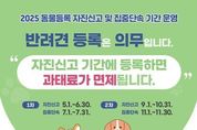 뉴스펀치 김완규 기자 | 양천구는 반려동물의 유실·유기 방지와 체계적인 관리 강화를 위해 오는 10월 31일까지 ‘동물등록 자진신고 기간’을 운영한다고 9일 밝혔다. 현행 동물보호법에 따르면 2개월령 이상의 반려견은 의무적으로 동물등록 대상이며, 소유자 정보나 동물의 상태가 변경(유실, 되찾음, 사망 등)된 경우에도 반드시 변경 신고를 해야 한다. 구는 소유자의 자발적 동물등록을 유도하고 등록 미비로 발생하는 각종 문제를 사전에 차단하기 위해 자진신고 기간을 운영하고 있으며, 이 기간에 신규 등록하거나 변경사항을 신고하면 미등록·미신고에 따른 과태료를 면제하고 있다. 동물등록은 구에서 대행기관으로 지정한 동물병원을 방문해 진행하면 된다. 등록 방식은 마이크로칩을 피하에 삽입하는 내장형과 목걸이 형태로 부착하는 외장형 중 선택할 수 있다. 변경 신고는 동물등록 대행기관을 통해 접수하거나, ‘정부24’ 또는 ‘국가동물보호정보시스템’에서 온라인으로도 가능하다. 구는 특히 내장형 동물등록을 진행한 소유주에게 동물등록비도 지원하고 있다. 올해는 총 250마리를 대상으로 지원하며, 동물등록 대행기관에서 내장형