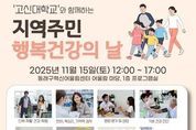 뉴스펀치 김길룡 기자 | 부산 동래구는 오는 11월 15일 낮 12시부터 동래구 혁신어울림센터(동래구 금강로 129) 1층 어울림 마당에서 고신대학교와 함께 ‘지역 주민 행복 건강의 날’ 행사를 개최한다고 밝혔다. 이번 행사는 지역 주민의 건강 증진과 삶의 질 향상을 위해 마련된 것으로, 어린이부터 성인까지 전 연령층이 참여할 수 있다. 혁신어울림센터 행사장 내 각 부스는 체험 내용과 참여 인원에 따라 운영시간이 상이하며, 모든 프로그램은 현장에서 선착순 접수로 참여할 수 있다. 행사에는 고신대학교의 복음병원과 웰니스센터가 참여해 전문적인 건강 체험과 상담 프로그램을 진행한다. 주요 프로그램으로는 △신체 재활 건강 체험(인지 재활치료, 손 기능 평가) △언어·목소리·기억력 검사 △영양판정 및 상담 △기본 건강진단 △탄력밴드 운동 및 테이핑 요법 체험 △어린이 청진기 만들기 체험 등이 운영될 예정이다. 동래구 관계자는“이번 행사는 주민들이 쉽고 즐겁게 건강을 점검하고, 일상 속 건강관리 습관을 기르는 데 도움을 드리기 위해 준비했다”라며 “고신대학교와의 협력을 통해 전문성과 신뢰도를 높인