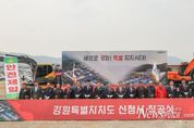 뉴스펀치 조평훈 기자 | 강원특별자치도는 3월 30일 오전 11시 춘천시 동내면 고은리 일원에서 ‘강원특별자치도 신청사 착공식’을 개최했다. 착공식에는 김진태 도지사를 비롯해, 한기호 국회의원(춘천‧철원‧화천‧양구을), 김시성 도의장, 신영재 홍천군수, 이병선 속초시장, 이상호 태백시장, 양양부군수, 지역 주민대표 등 1천여 명이 참석했다. 신청사 건립사업은 약 5,000억 원 사업비가 투입되며, 도민 중심의 복합행정문화공간으로 조성된다. 신청사는 약 10만㎡ 부지에 지하 2층, 지상 9층 규모로 건립되며, 다목적 강당과 전면 광장, 옥상정원 등을 갖춰 도민이 언제나 찾아와 소통하고 이용할 수 있는 열린 공간으로 조성된다. 특히 기존 청사의 주요 불편사항으로 지적됐던 주차난 해소를 위해 1,600대 이상 수용 가능한 주차공간을 확보하는 등 도민 편의 증진과 행정 효율성 제고를 동시에 고려한 스마트 청사로 건립된다. 도는 이번 부지 조성 및 진입도로 등 기반시설 공사를 시작으로 올해 하반기 본격적인 건축공사에 착수해 2029년 준공을 목표로 사업을 추진할 계획이다. 김진태