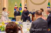 뉴스펀치 김용희 기자 | 이재명 대통령 부부는 23일 저녁, 국빈 방한 중인 룰라 다 시우바 대통령 부부와 브라질 대표단을 청와대 영빈관으로 초청해 만찬을 함께 했다. 만찬에는 강훈식 비서실장과 위성락 국가안보실장, 김용범 정책실장 등 청와대 참모들과 구윤철 부총리 겸 재정경제부 장관, 배경훈 부총리 겸 과학기술정보통신부 장관 등 정부 인사들, 제22대 국회 한-브 의원 친선협회 협회장인 박정 의원 등 정계인사들과 이재용 삼성그룹 회장, 최태원 SK그룹 회장, 구광모 LG그룹 회장, 정의선 현대차그룹 회장, 한국경영자총협회장을 맡고 있는 손경식 CJ그룹 회장 등 재계 인사들, 세징야 대구 FC 축구선수, 이승연 화가 등 학계와 문화계, 친선협회 인사들 120여 명이 참석했다. 이재명 대통령은 만찬사를 통해 소년공 시절을 회고하면서 “몸으로 배운 노동의 가치와 인간의 존엄성은 더 나은 세상을 바라는 열망의 원동력이 됐다”고 언급했다. 이어 “비슷한 삶의 궤적을 공유하고 있었기에 룰라 대통령님을 처음 만났을 때부터 마치 오랜 친구를, 또 동지를 만난 것처럼 무척이나 반가웠다”고 전했다. 또한 삼성, LG, 현대 자